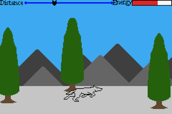This game tells the story of a wolf who has left its pack for food and now seeks to return home (hence the referenced biblical parable.) To win, he must cover the distance between the starting location and the pack while retaining energy. To get energy, the wolf must hunt, represented in a different hunting screen (right).