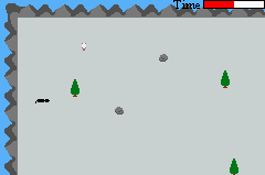 To play: use the left and right arrow keys to run. Running right will bring you closer to your pack (see "Distance" key on top). If your energy runs low (upper left) you must hunt using the "A" key (usually "Z" on an emulator.) Hunting changes the game to a top-down view, in which you may run anywhere except the mountains and find the rabbit that is also running around. If you catch the rabbit before the Timer runs out (upper right), your energy will increase. If not, your energy will lower due to the time wasted hunting. Finally, if you make it to the end without your energy running out, you win!